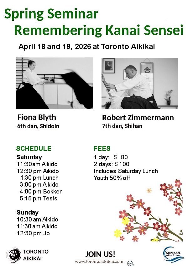 | March 28-30, 2025 (Friday - Sunday) Remembering Kanai Sensei - Spring Aikido Seminar at Toronto Aikikai, commemorating the 21st anniversary of his passing. Instructed by Fiona Blyth Shidoin, 6th dan and Robert Zimmermann Shihan, 7th dan. Information and Registration |