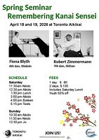 | April 18 - 19, 2026 (Saturday - Sunday) Remembering Kanai Sensei - Spring Aikido Seminar at Toronto Aikikai, commemorating the 22nd anniversary of his passing. Instructed by Fiona Blyth Shidoin, 6th dan and Robert Zimmermann Shihan, 7th dan. Information and Registration |